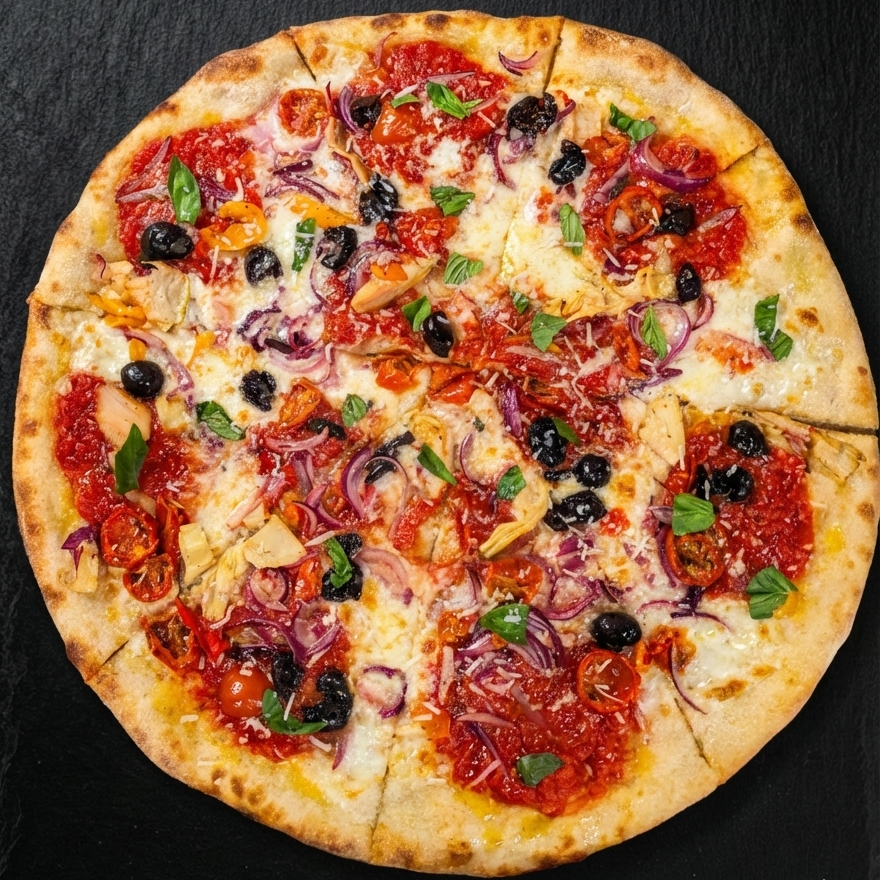 Mozzarella, Parmigiano-Reggiano, Végé Mix (Oignons Rouges, Artichauts, Tomates Cerises Marinées, Poivrons Rôtis), Olives Noires Grecques, Basilic, Ail, Huile d’Olive, Sauce Tomate BIO